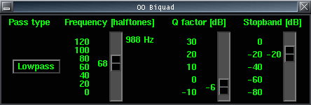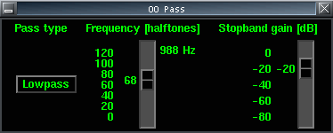 1st order filter, type low/high pass. Frequency in halftones and Hz determines the -3dB cut off frequency. Stopband gain is in dB.