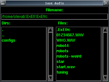 This is a new feature, which allows you to post-process a previously recorded sound file. You can record the input stream during playing with an effect, and then process the file with another effect! You hear the sound online while changing the effects to your taste. After the file has finished, ExEf plays as usual. This feature can be used powerfully even from command line. The format must be 16 bit mono, the ExEf's sampling frequency is used.